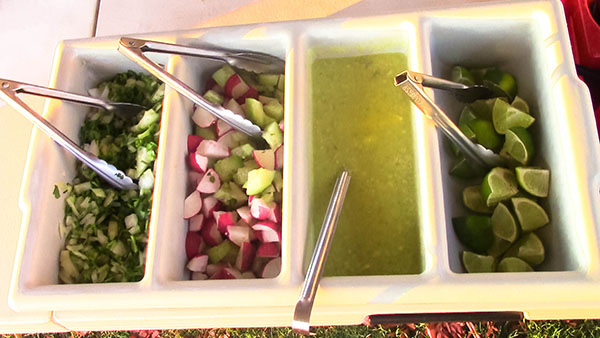 Virginia and Karen offer several cool condiments to balance the slightly greasy pupusas and tacos -- cilantro with onion, radish with cucumber, tomatillo salsa and cut limes. |