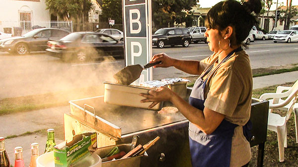 Karen prepares meats for the tacos -- chicken, pork and beef.